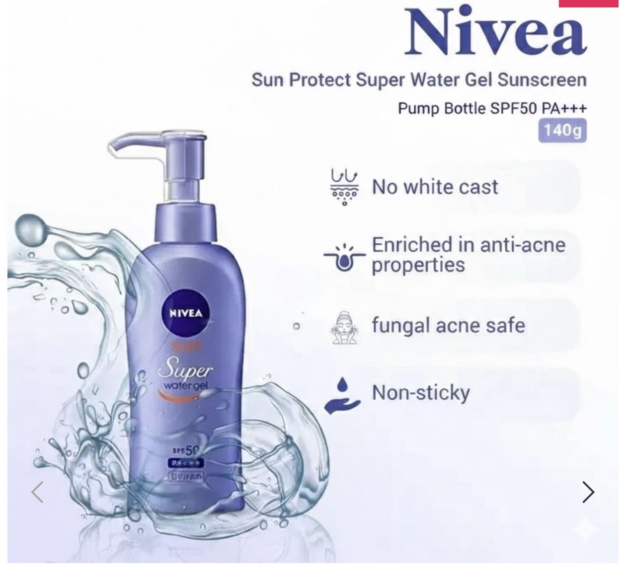 Nivea Sun Protect Super Water Gel is a lightweight daily sunscreen gel that spreads quickly, feels fresh on skin, and supports UV protection without stickiness.
