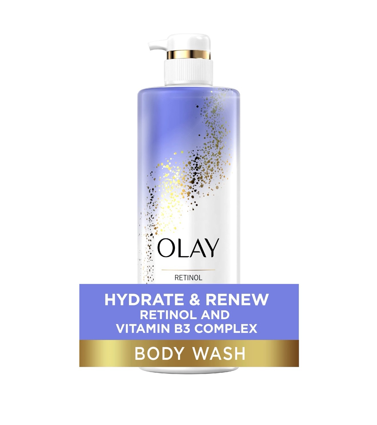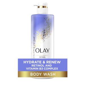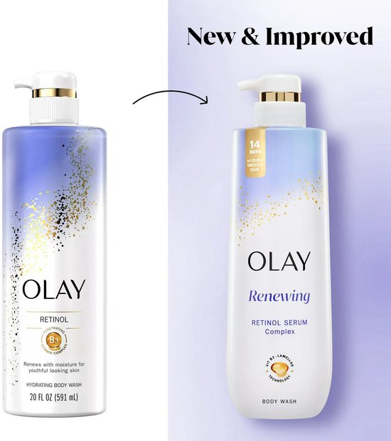 Olay Retinol Body Wash combines Retinol and Vitamin B3 Complex to cleanse, deeply hydrate, and renew skin, offering visible improvements in texture and brightness in as little as 14 days to 4 weeks. It penetrates up to 10 layers deep, improving skin cell turnover to reduce roughness and dullness, making it suitable for daily use to achieve softer, more radiant, and youthful-looking skin